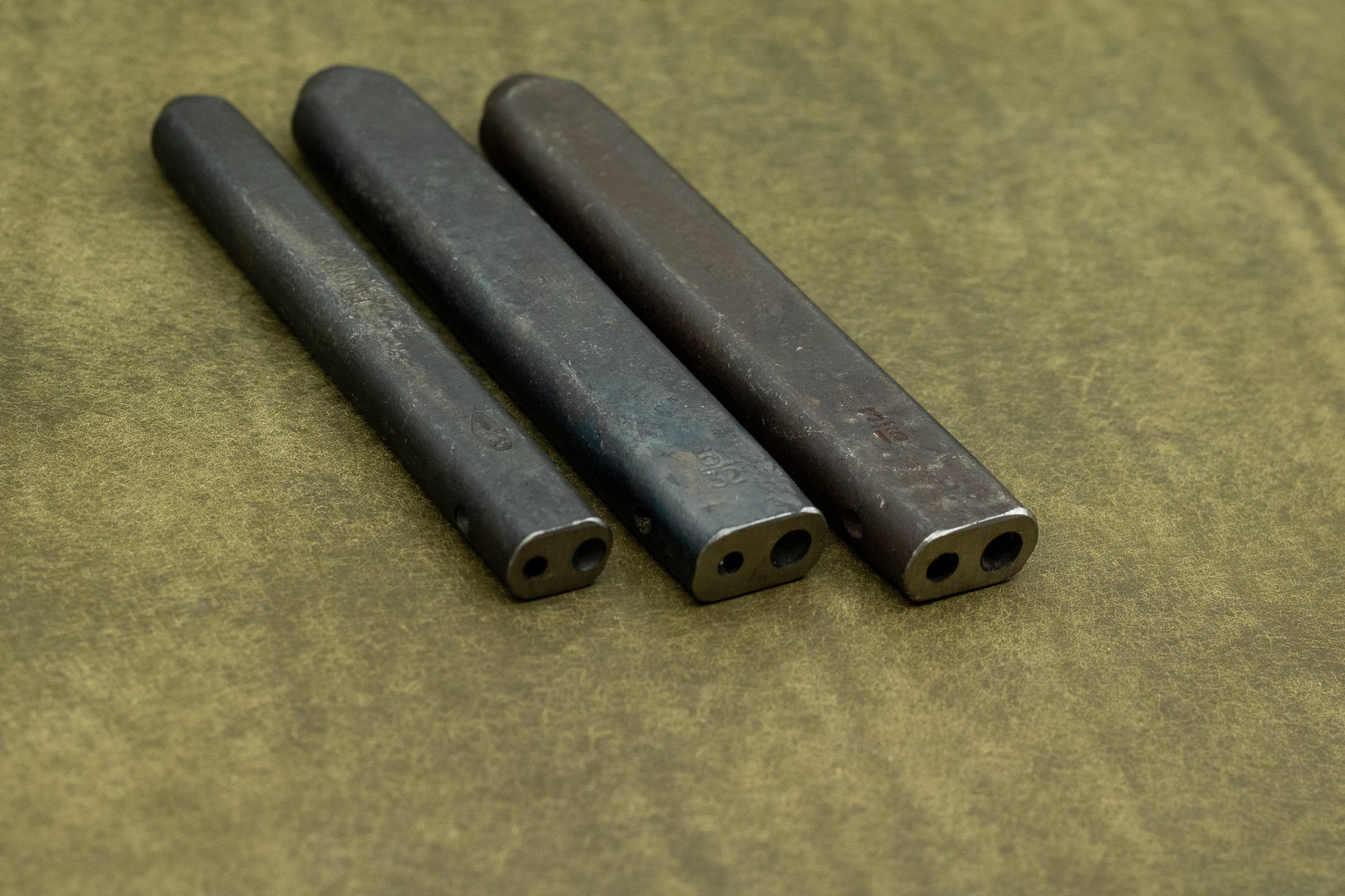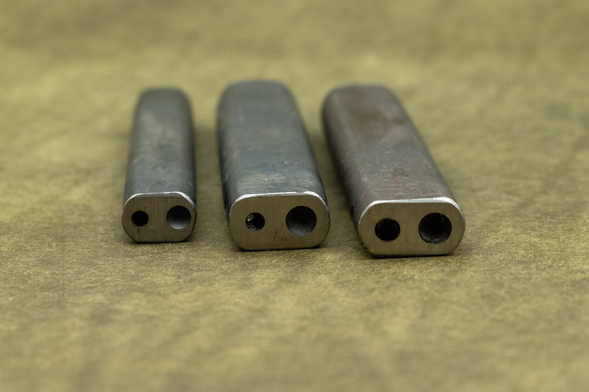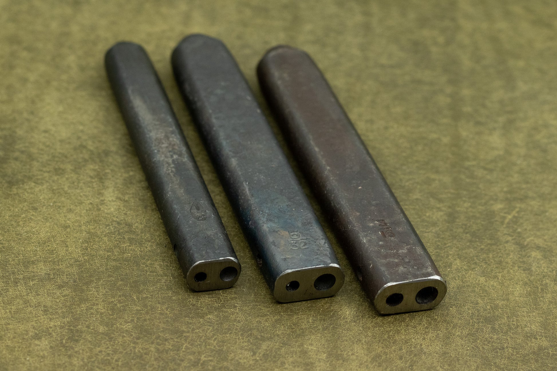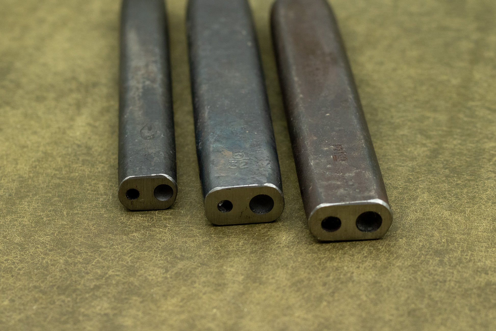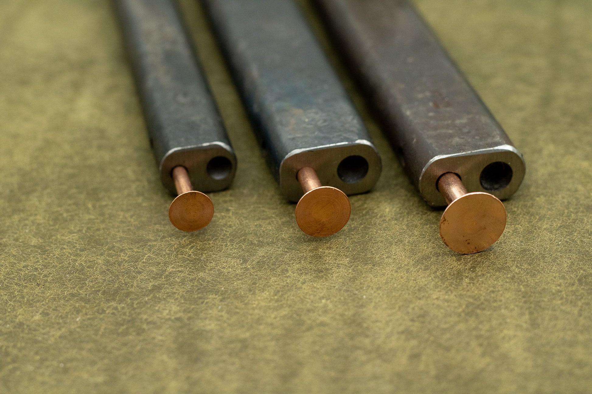 The rivet setter is available in three different sizes. To be able to attach the rivet to the leather, the shaft needs to fit precisely in the hole of the rivet setter.